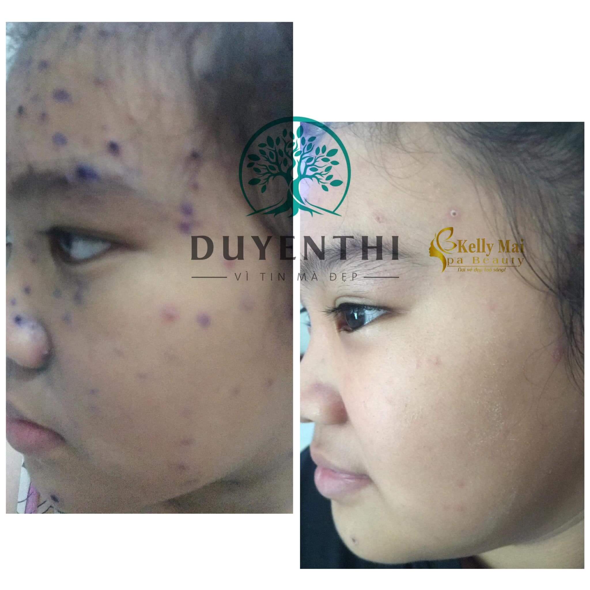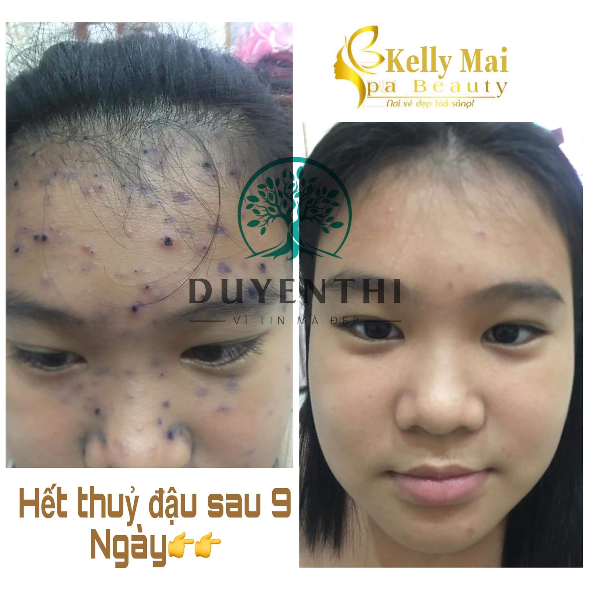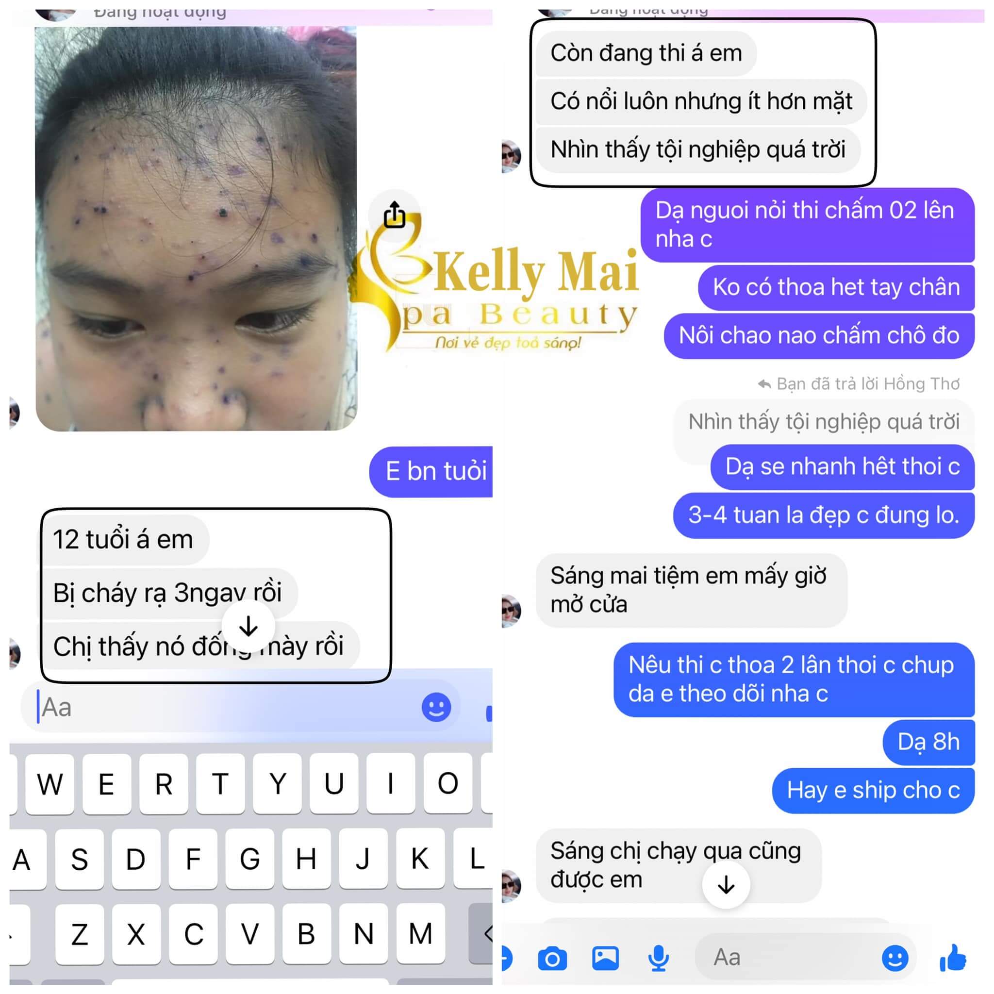 . Đây là bé khách 12 tuổi của nhà KELLY MAI SPA bé bị thuỷ đậu 3 ngày, đã lây lan xuống tay chân. Tuy nhiên khi mẹ bé cho bé sử dụng #02plus+ #Cao_sẹo_Bách_Y_Sâm thì sau #9ngày da bé đã cai thiện 95% rồi, sẹo đầy 80-90% luôn ạ. Hầu như không còn di chứng của thuỷ đậu để lại.